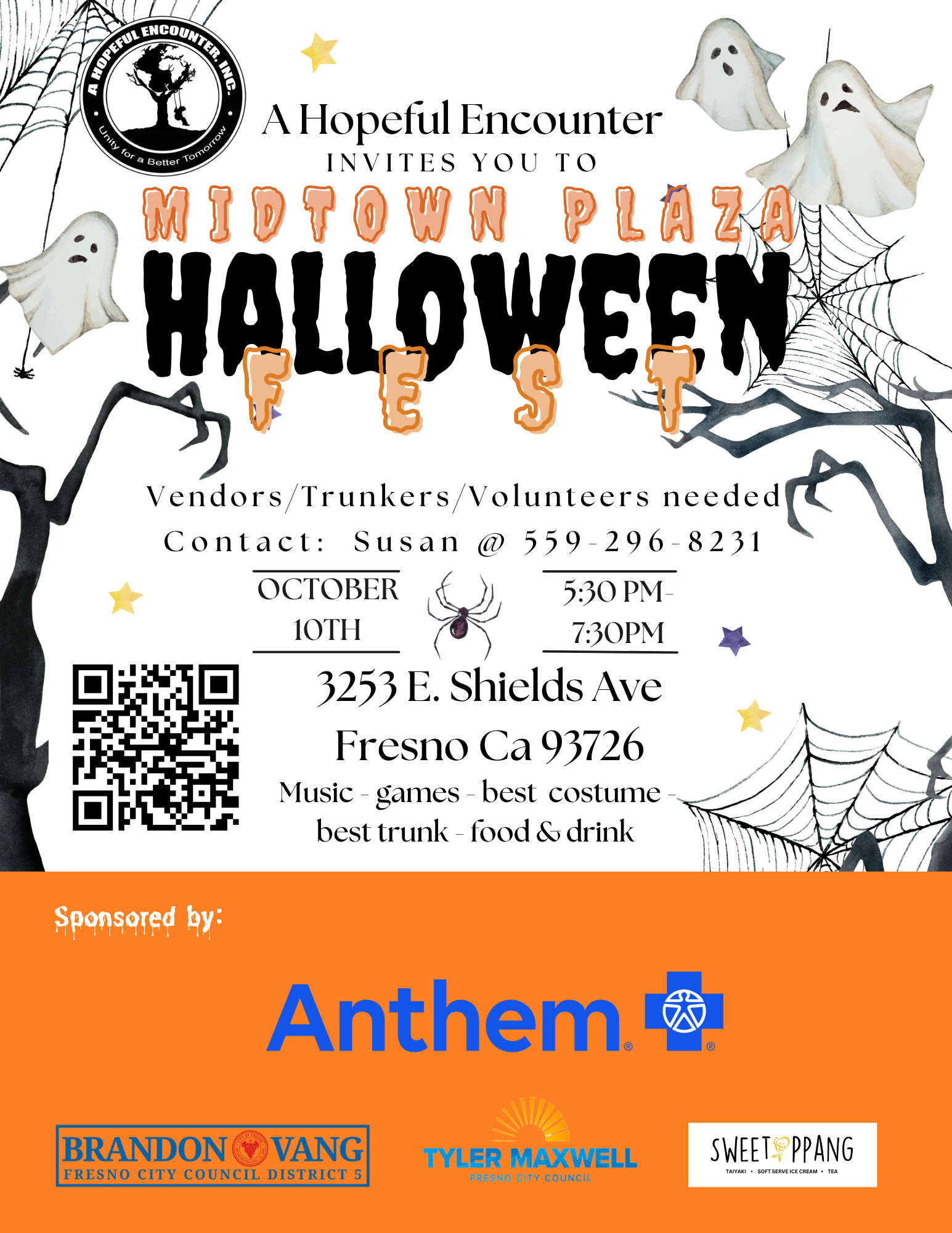 Join A Hopeful Encounter for our annual Trunk or Treat event at Midtown Plaza! This family-friendly Halloween celebration provides a safe environment for children to enjoy trick-or-treating from creatively decorated vehicle trunks while connecting with our community.